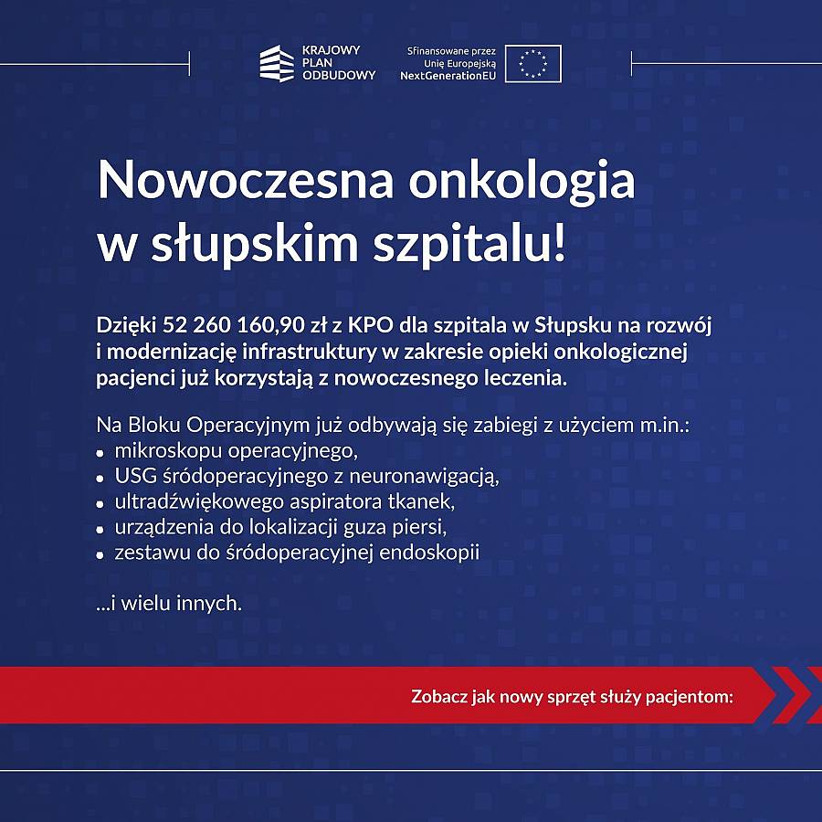 Dzięki 52 260 160,90 zł z KPO na bloku operacyjnym słupskiego szpitala wykonywane są już zabiegi z wykorzystaniem zaawansowanych technologii, które zwiększają dostępność i poprawiają jakość diagnostyki oraz leczenia onkologicznego.